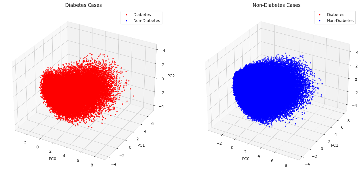 - PC3: この主成分は「BMI」(体格指数)に高い負荷量を持っており、「CholCheck」(コレステロール検査)や「GenHlth」(一般的な健康状態)にも影響を与えています。この主成分は「身体的健康とライフスタイル」を反映していると考えられます。